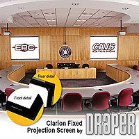 Improve your images with Clarion projection screens. These screens are designed for permanent wall mounting. The viewing surface is perfectly flat that results in perfect picture quality. Viewing surfaces have hem pocket on all four sides to accept screen insertion tubing. The Clarion's self-concealing aluminum frame now forms an attractive 2" border, for a clean, theatre-like appearance. The 2" wide beveled, extruded aluminum frame interconnects on site with one simple hand tool that Draper provides. Surface attaches to the extruded frame using an extruded plastic strip, eliminating pulling and puckering inherent to fabric attachment that utilizes snaps. Snap attachments are not acceptable as equivalent. Frame extrusions provide for horizontal and vertical surface tension adjustability to combat screen stretch and sag over time.
